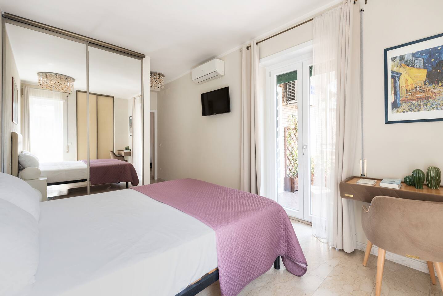 ROOM 1 Spacious and bright double bedroom, with private bathroom and charming terrace. The door room has a lock. The whole unit has a total of three bedrooms that can be rented separately and it has a shared living room It is very well connected to the center of Rome, both on foot and by public transport. The tram/bus stop is 30 meters away, and the nearby Trastevere train station provides easy access to the airport and other points in the city and region.