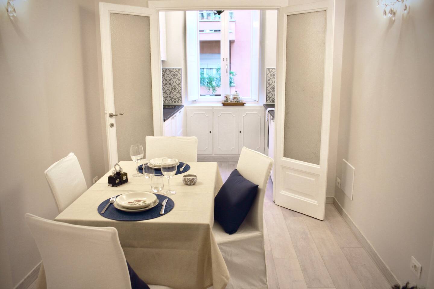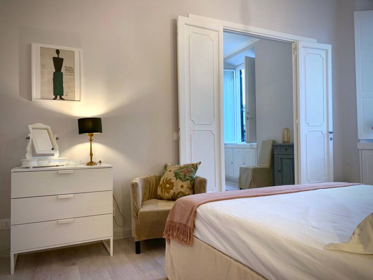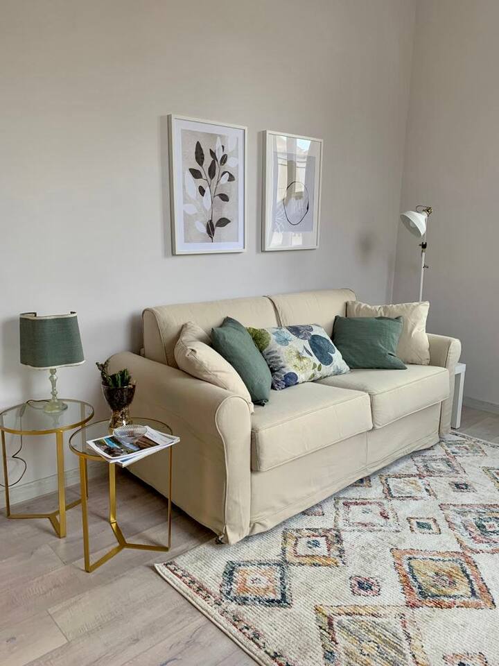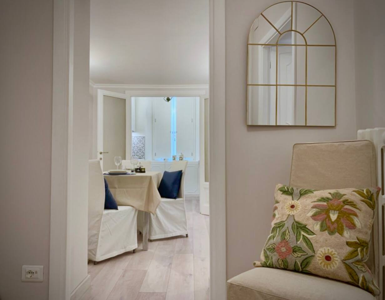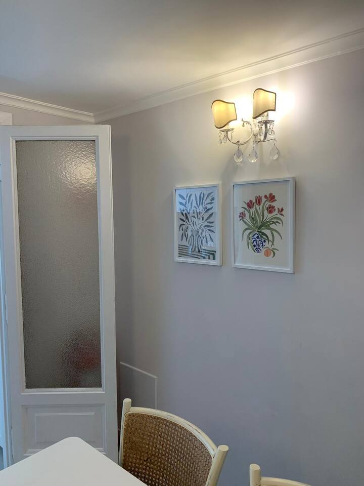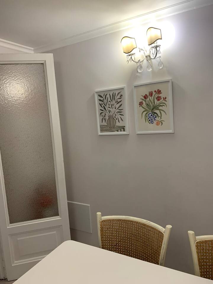 The apartment is spacious and full of light with large windows. The bedroom is spacious and with connecting doors to the sitting room where a sofa bed is available, perfect for families or a group of friends. The bathroom has a large walking shower, and the kitchen has a dinning table where your family and friends will enjoy having a relax conversation after a long day visiting museums. There you can cook a quick meal or have your refreshments ready in the fridge.
