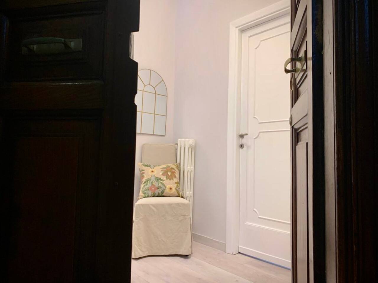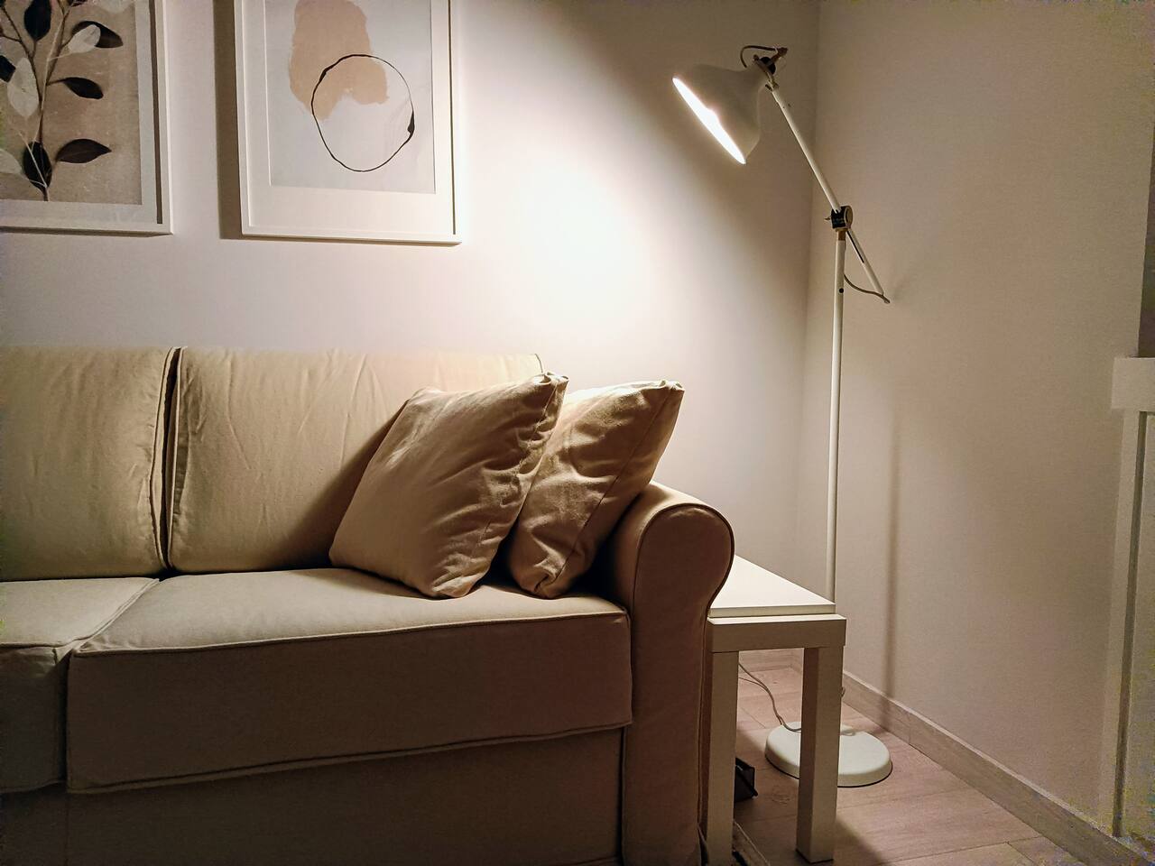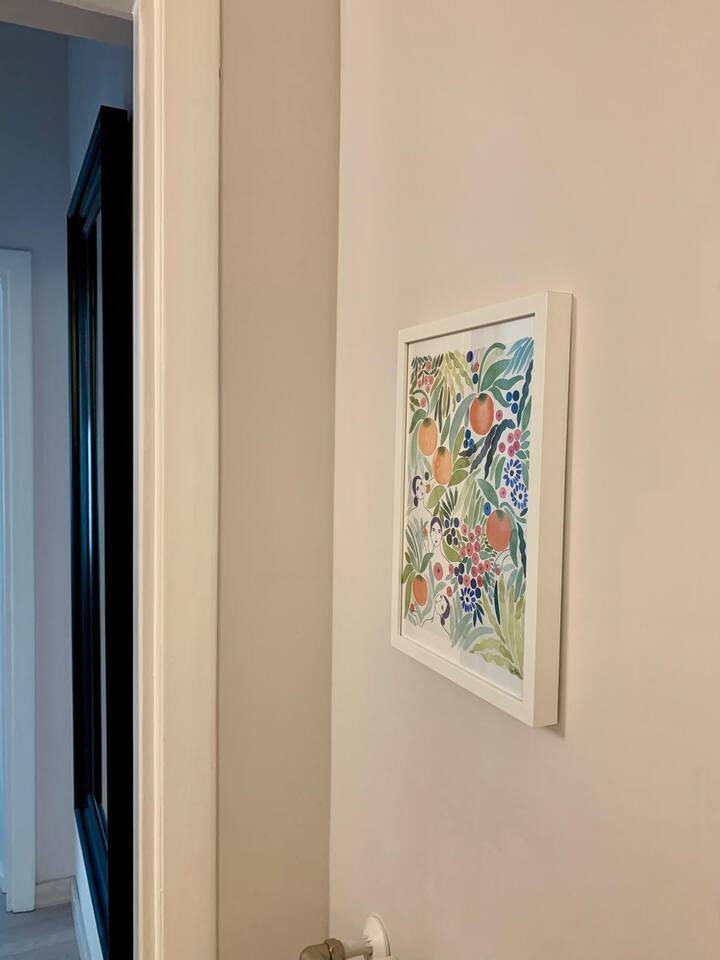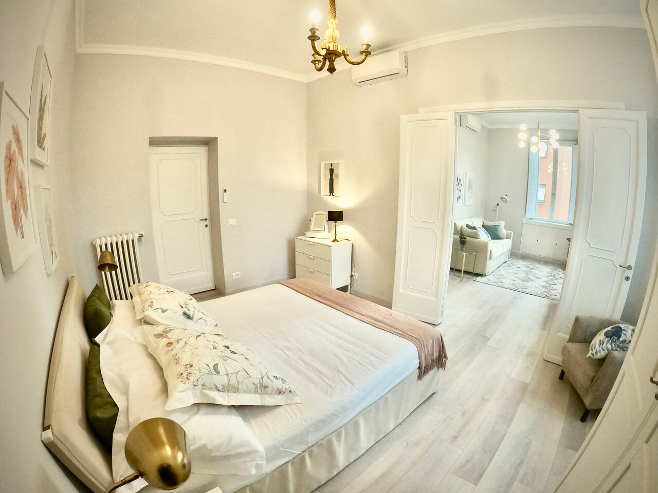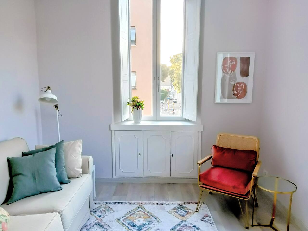 The apartment is spacious and full of light with large windows. The bedroom is spacious and with connecting doors to the sitting room where a sofa bed is available, perfect for families or a group of friends. The bathroom has a large walking shower, and the kitchen has a dinning table where your family and friends will enjoy having a relax conversation after a long day visiting museums. There you can cook a quick meal or have your refreshments ready in the fridge.