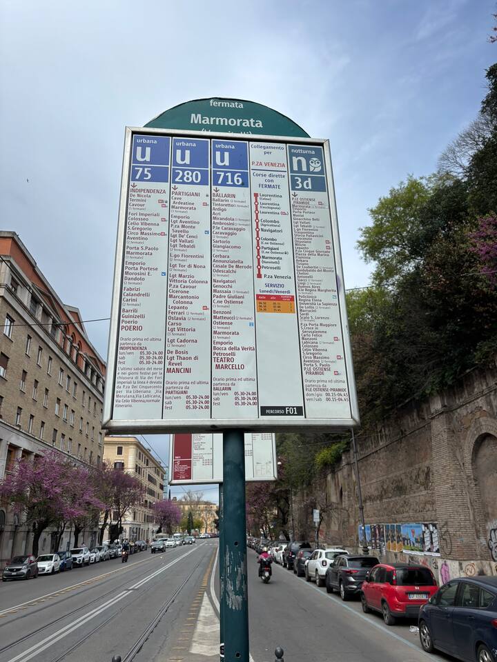 Despite its peaceful, residential vibe, Testaccio is very well connected: Metro: The nearest metro stop is Piramide (Line B), just a 10-minute walk from the apartment. From there, you can reach the Colosseum in 2 stops, and Termini station in 4 stops. Bus/Tram: Numerous buses and the nearby Tram 3 line go toward Trastevere, the Colosseum, and San Giovanni. Walking: You can walk to Trastevere (across the Tiber) in 15–20 minutes, and to Aventine Hill and the Orange Garden in 10 minutes.