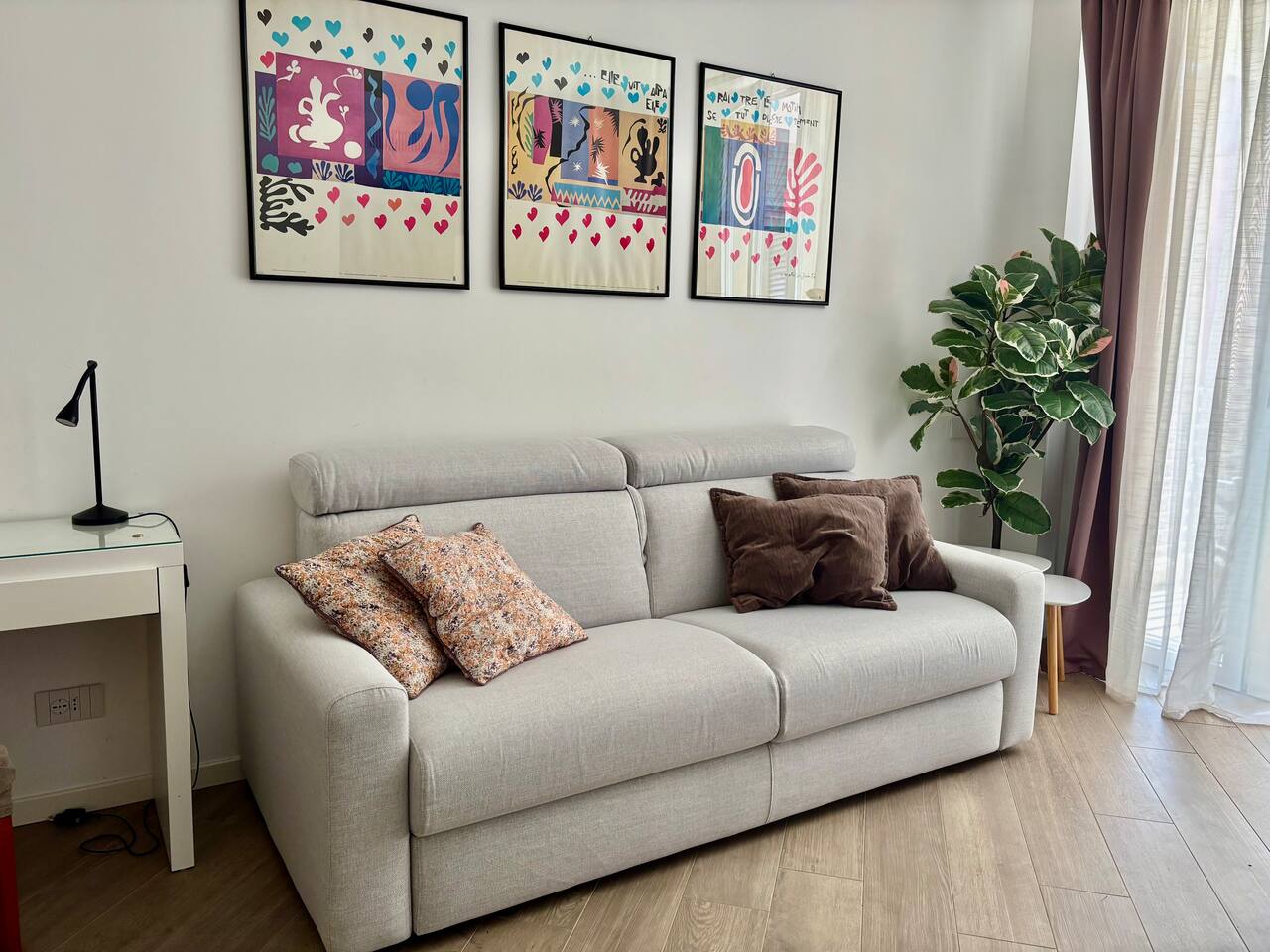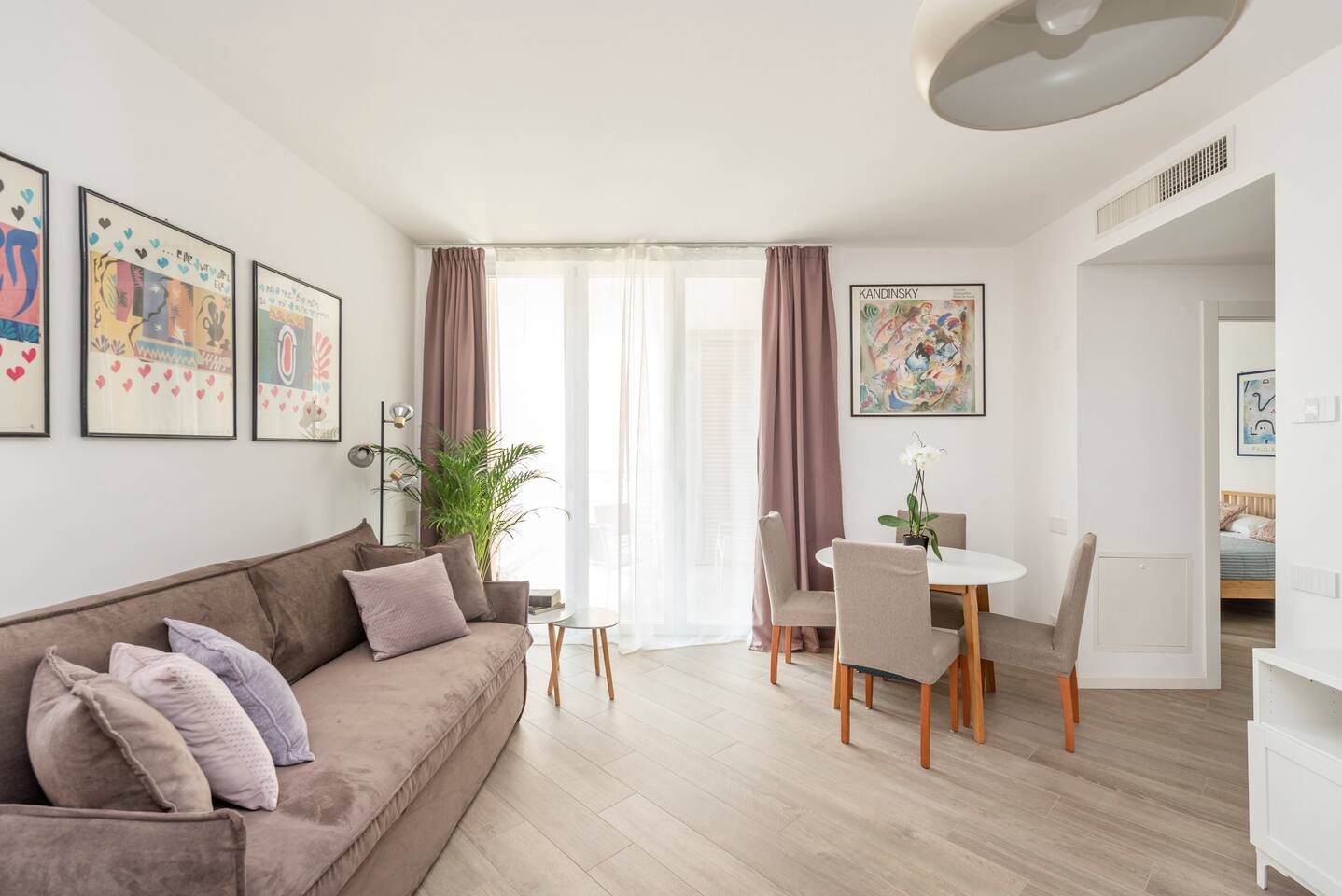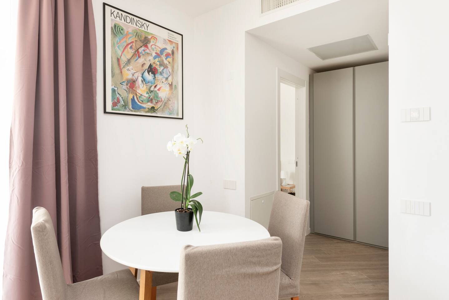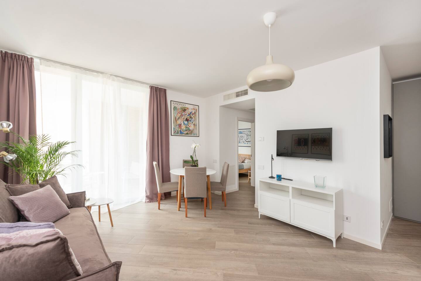Casa di Miranda is ideal for a couple or a group of up to four people with a double bed in the bedroom and a comfortable sofa bed for two in the living room. Casa di Miranda is elegantly decorated with posters of historical contemporary art exhibitions, it has large closets, a bathroom with a large shower. It has all the necessary comforts to spend several days in it, such as a perfectly equipped kitchen, dining area, A/C, underfloor heating, washing machine, dishwasher or WIFI to stay connected with relatives and friends or if it is necessary to work. You can also enjoy a comfortable terrace to get some fresh air while you enjoy an aperitif, when the weather permits. The building has a large elevator and the beauty of its hall will welcome you before entering the apartment.