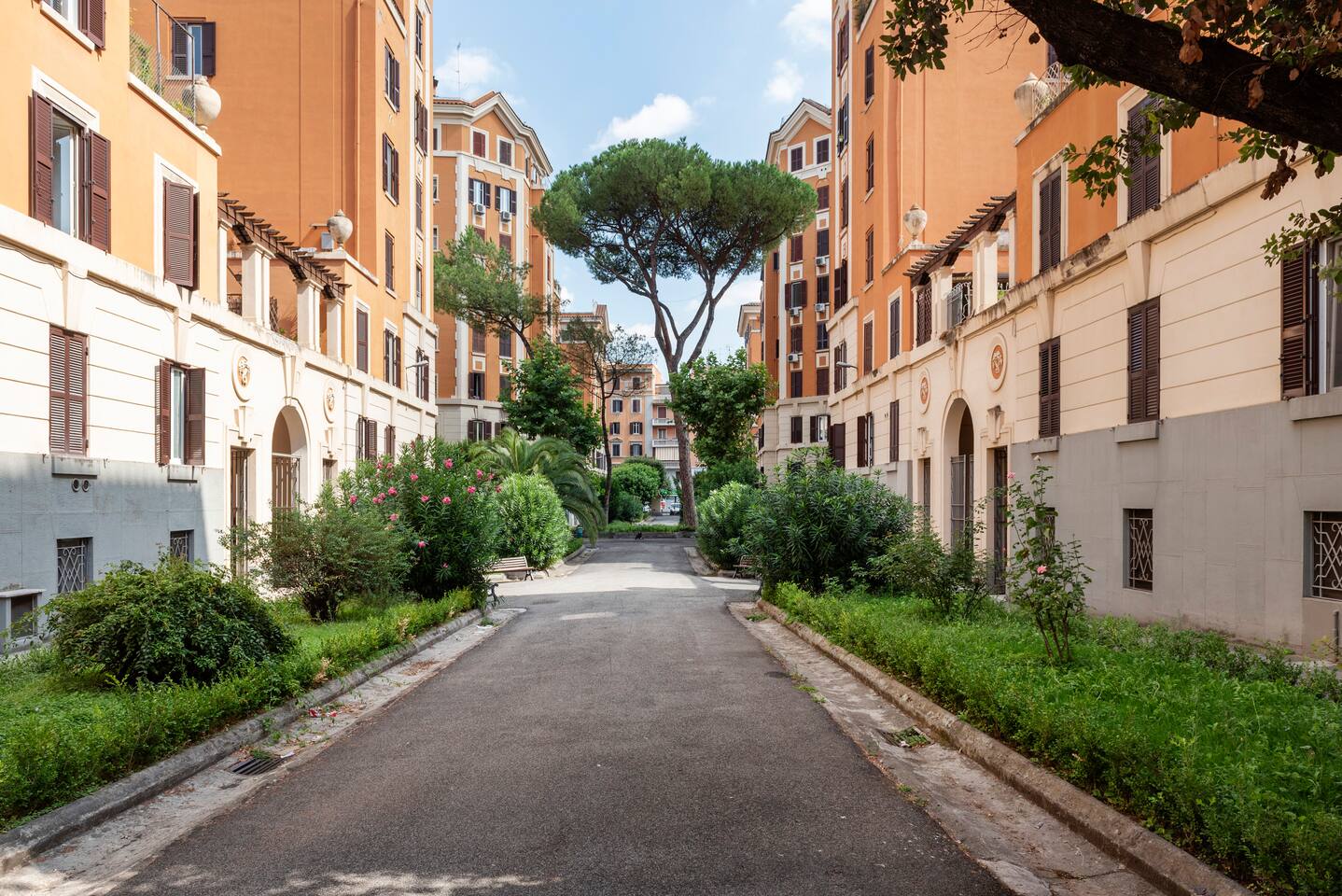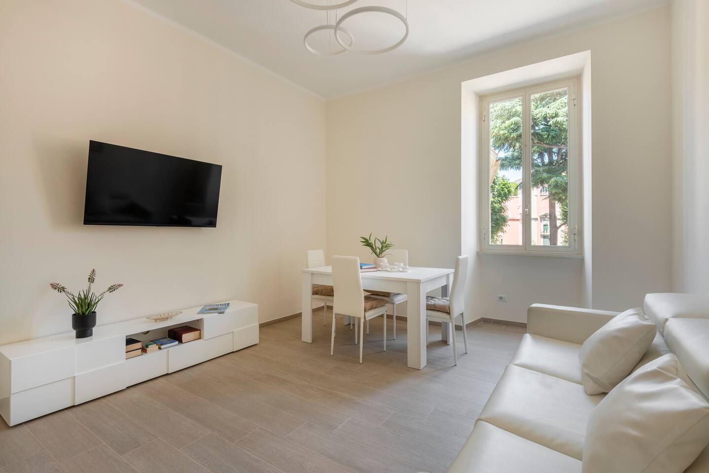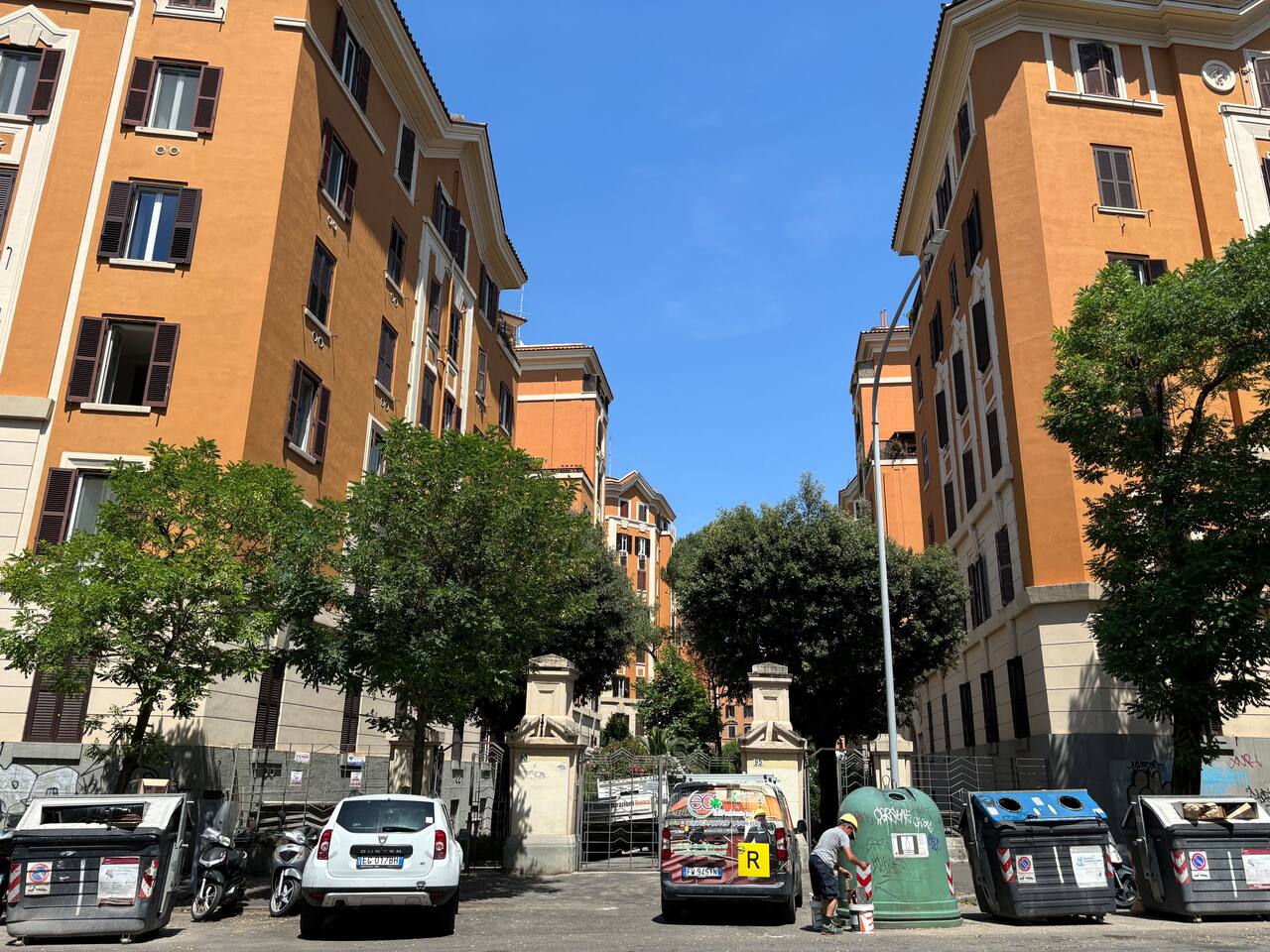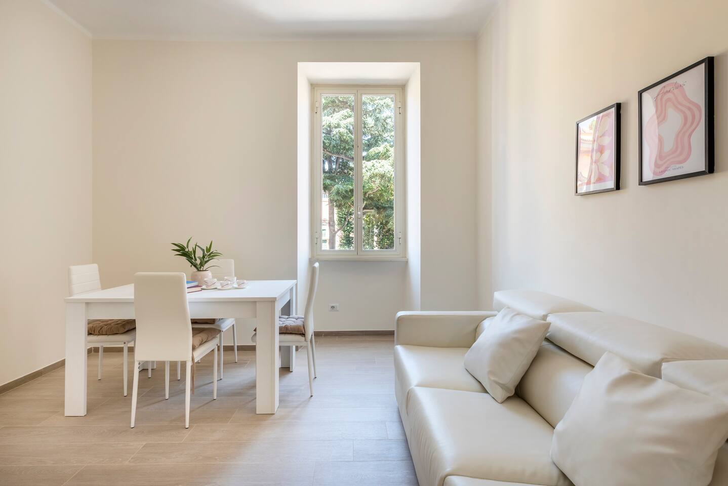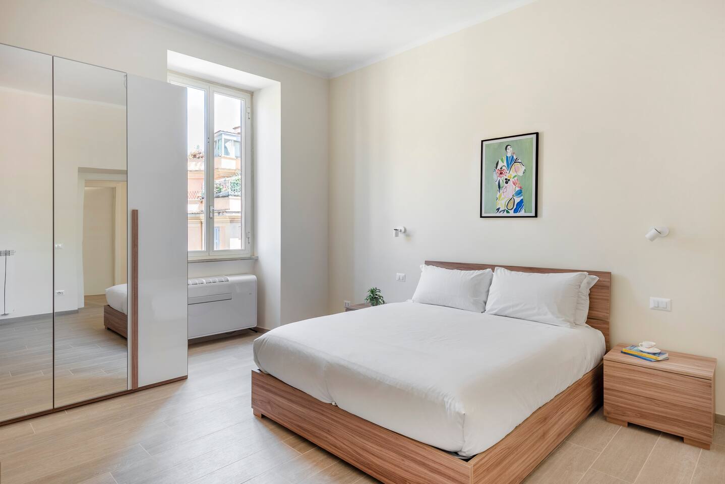 Spacious and full of light apartment with 2 bedrooms and a large living room with a double sofa bed. It has a bathroom with a wonderful walking shower, kitchen, and other amenities such as air conditioning, Wi-Fi, and large windows with views of the garden areas of the complex. It's located in an elegant complex with well-kept garden areas. The metro lines A and C are at few minutes by foot, also bus to the center just downstairs and train station (Tuscolana) nearby.