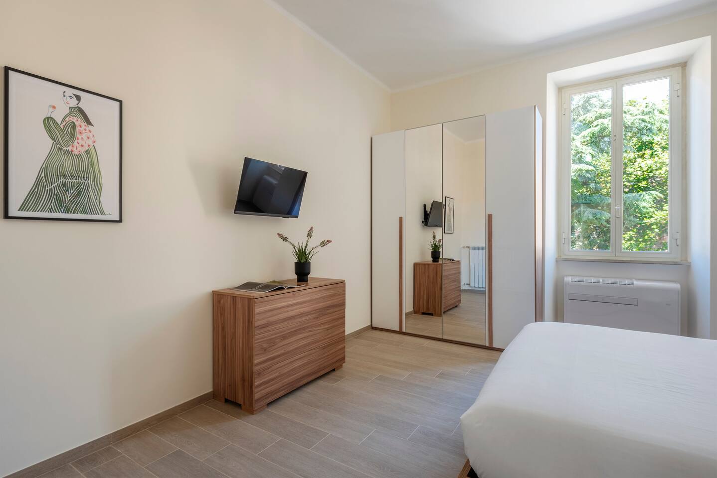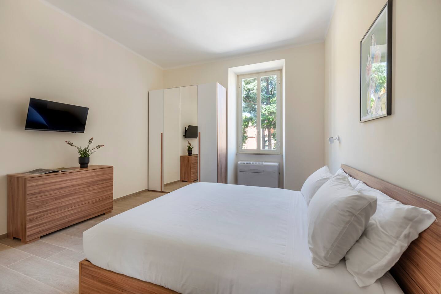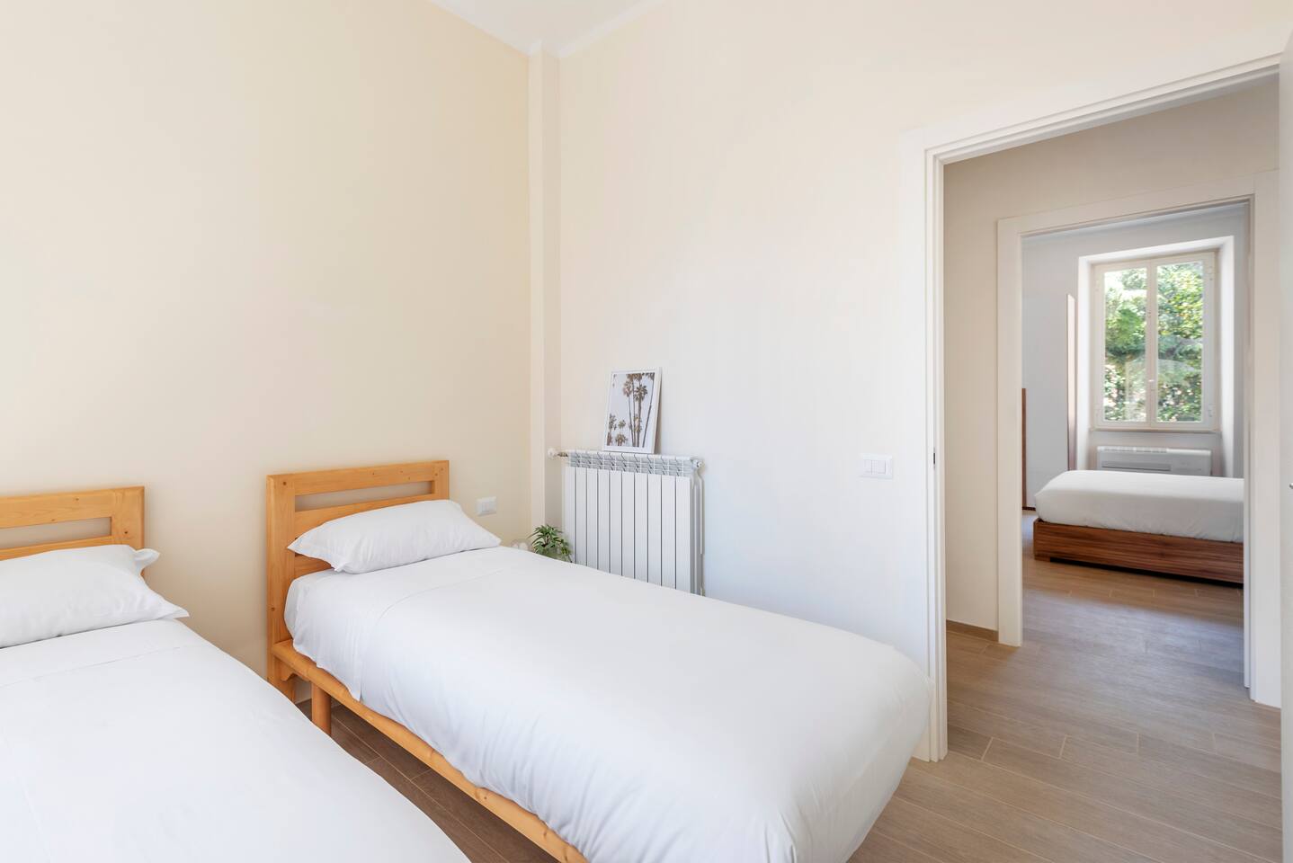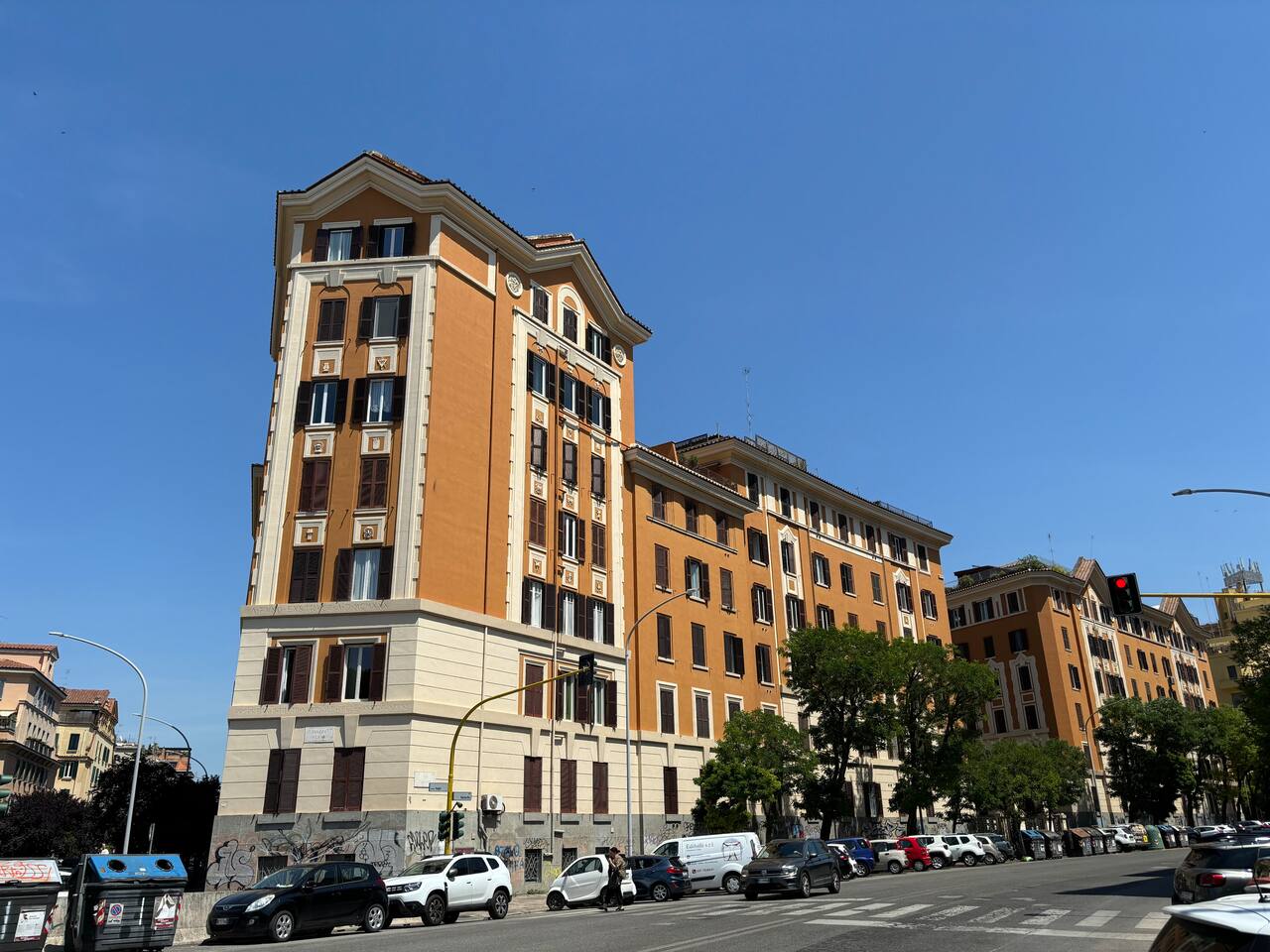 Spacious and full of light apartment with 2 bedrooms and a large living room with a double sofa bed. It has a bathroom with a wonderful walking shower, kitchen, and other amenities such as air conditioning, Wi-Fi, and large windows with views of the garden areas of the complex. It's located in an elegant complex with well-kept garden areas. The metro lines A and C are at few minutes by foot, also bus to the center just downstairs and train station (Tuscolana) nearby.