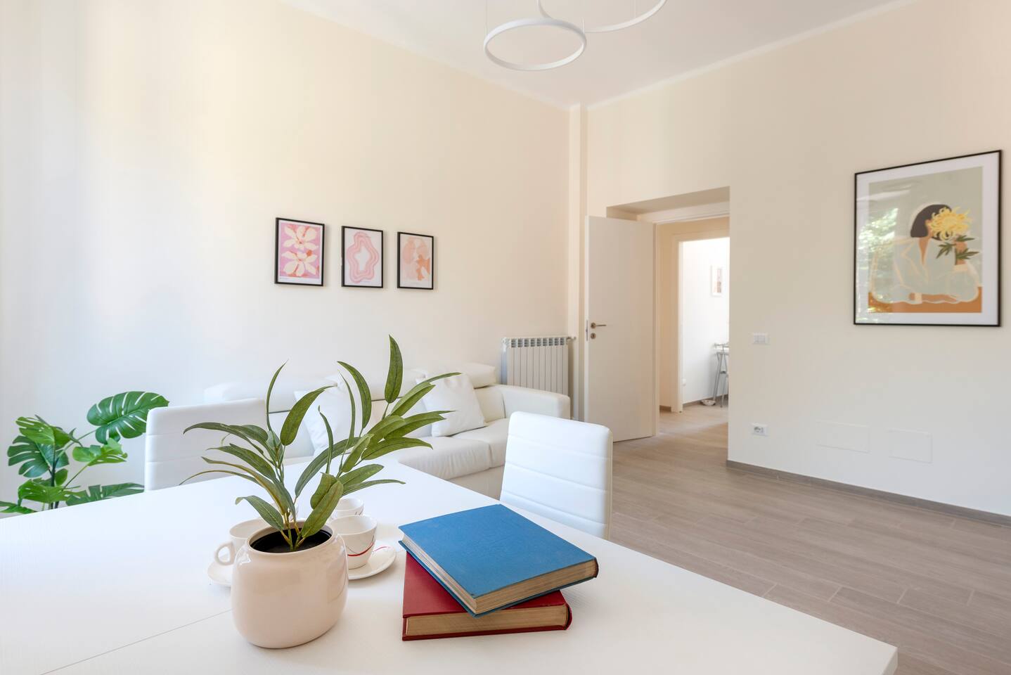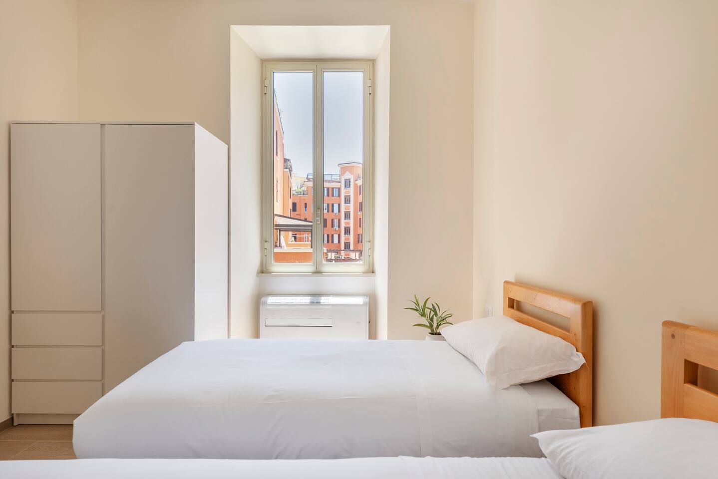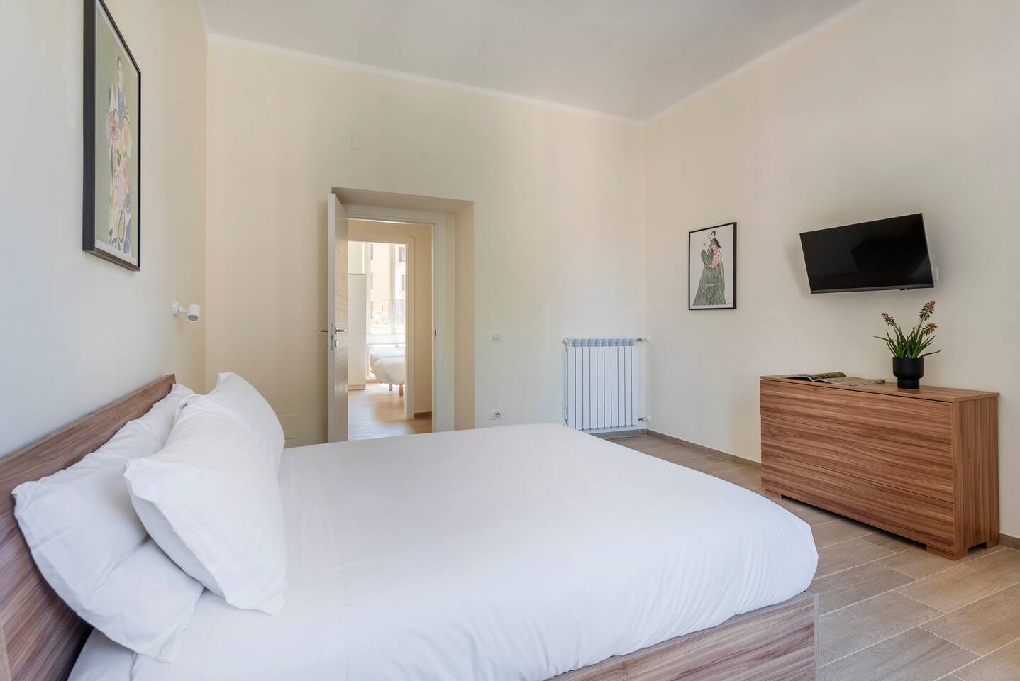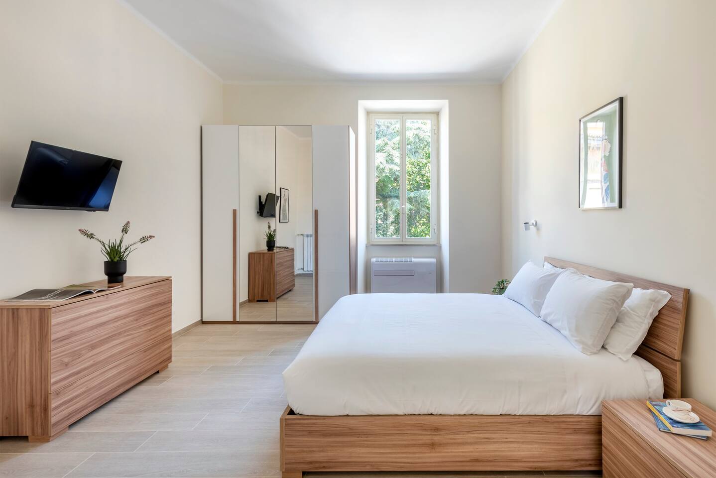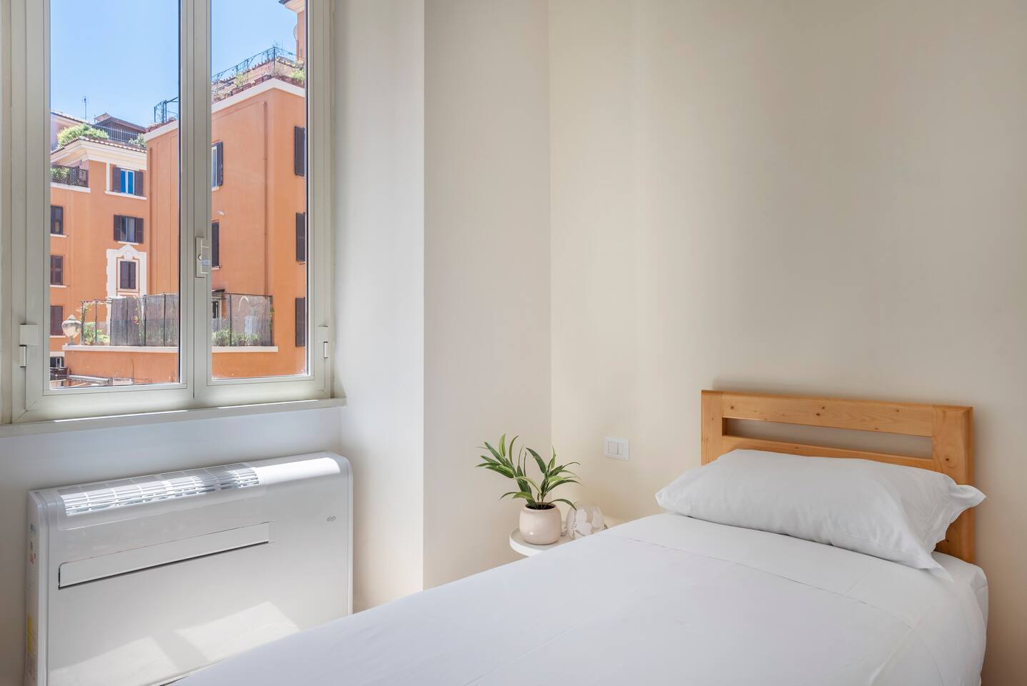 Spacious and full of light apartment with 2 bedrooms and a large living room with a double sofa bed. It has a bathroom with a wonderful walking shower, kitchen, and other amenities such as air conditioning, Wi-Fi, and large windows with views of the garden areas of the complex. It's located in an elegant complex with well-kept garden areas. The metro lines A and C are at few minutes by foot, also bus to the center just downstairs and train station (Tuscolana) nearby.