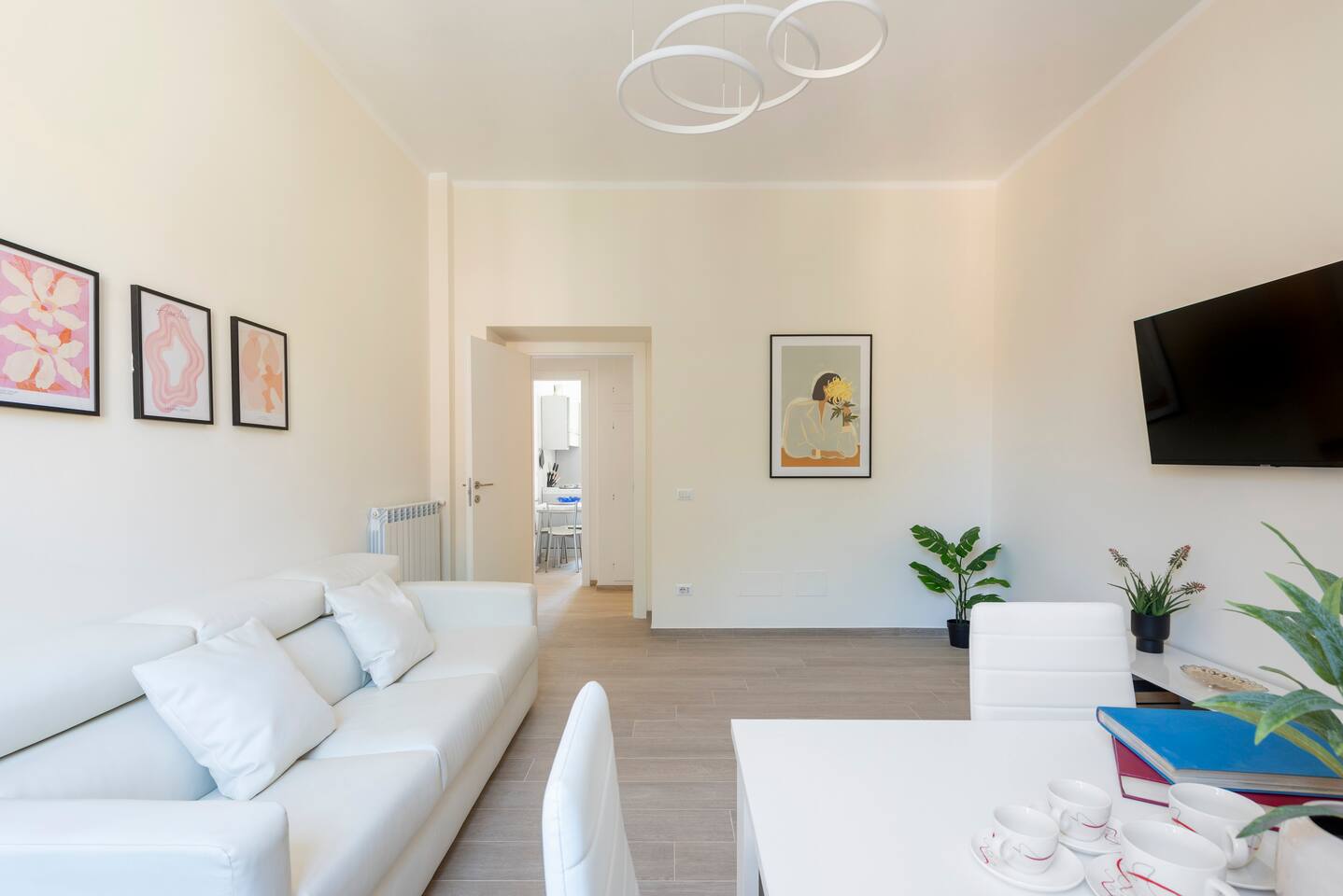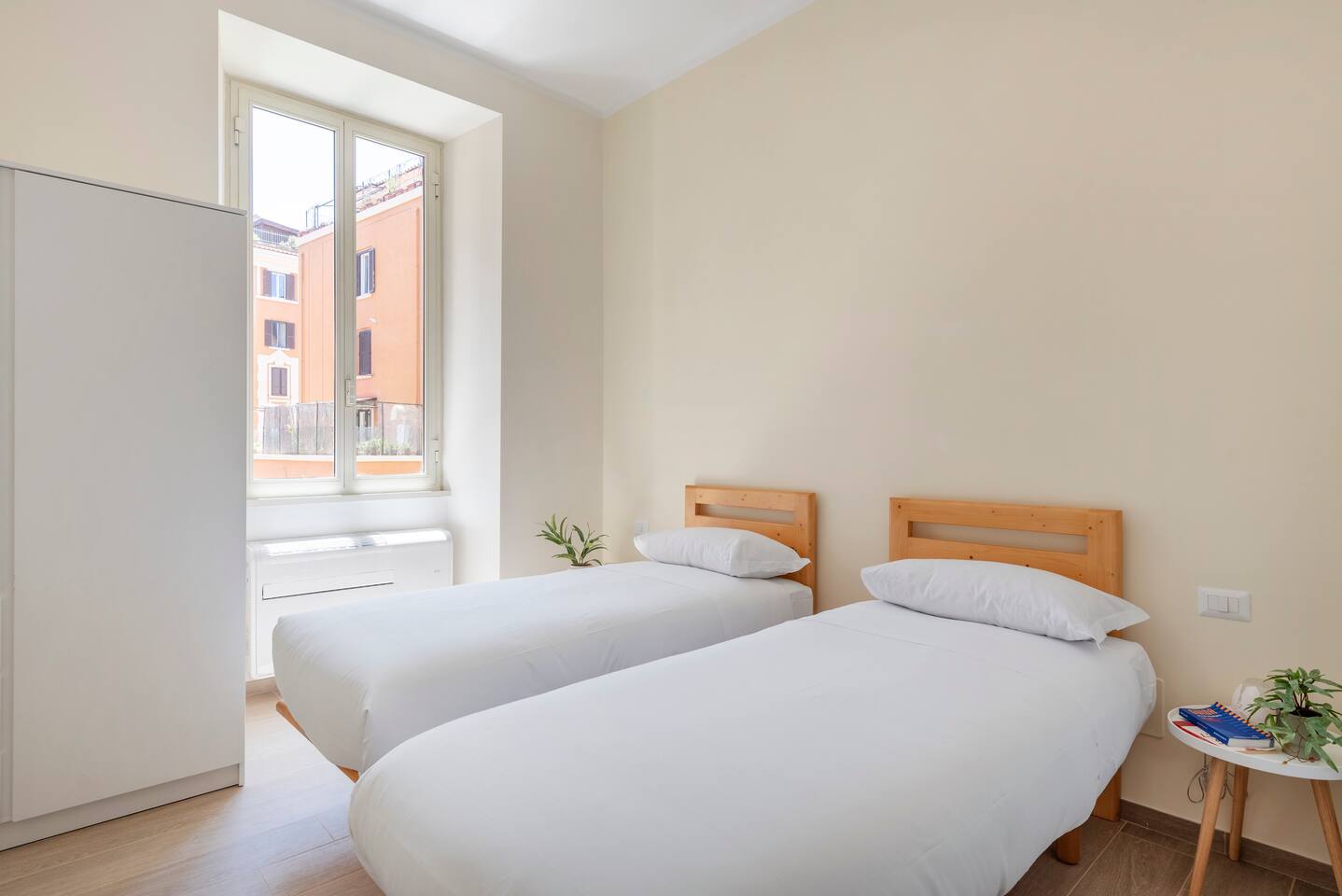 First Bedroom 1 bed queen size (160cmx190cm) Second Bedroom 2 sigle beds in the second bedroom Living room 1 sofa bed for two in the living room. By defoult the sofa bed won't be ready as bed. If you need it as bed, please require it in advance. Dinning area Kitchen with Fridge, gas stove, ... Washing Maschine Bathroom with walking shower and bidet Living room with dinning area and smart TV Airconditioning in the 2 bedrooms. WIFI The living room and the main bedroom have Smart TV.