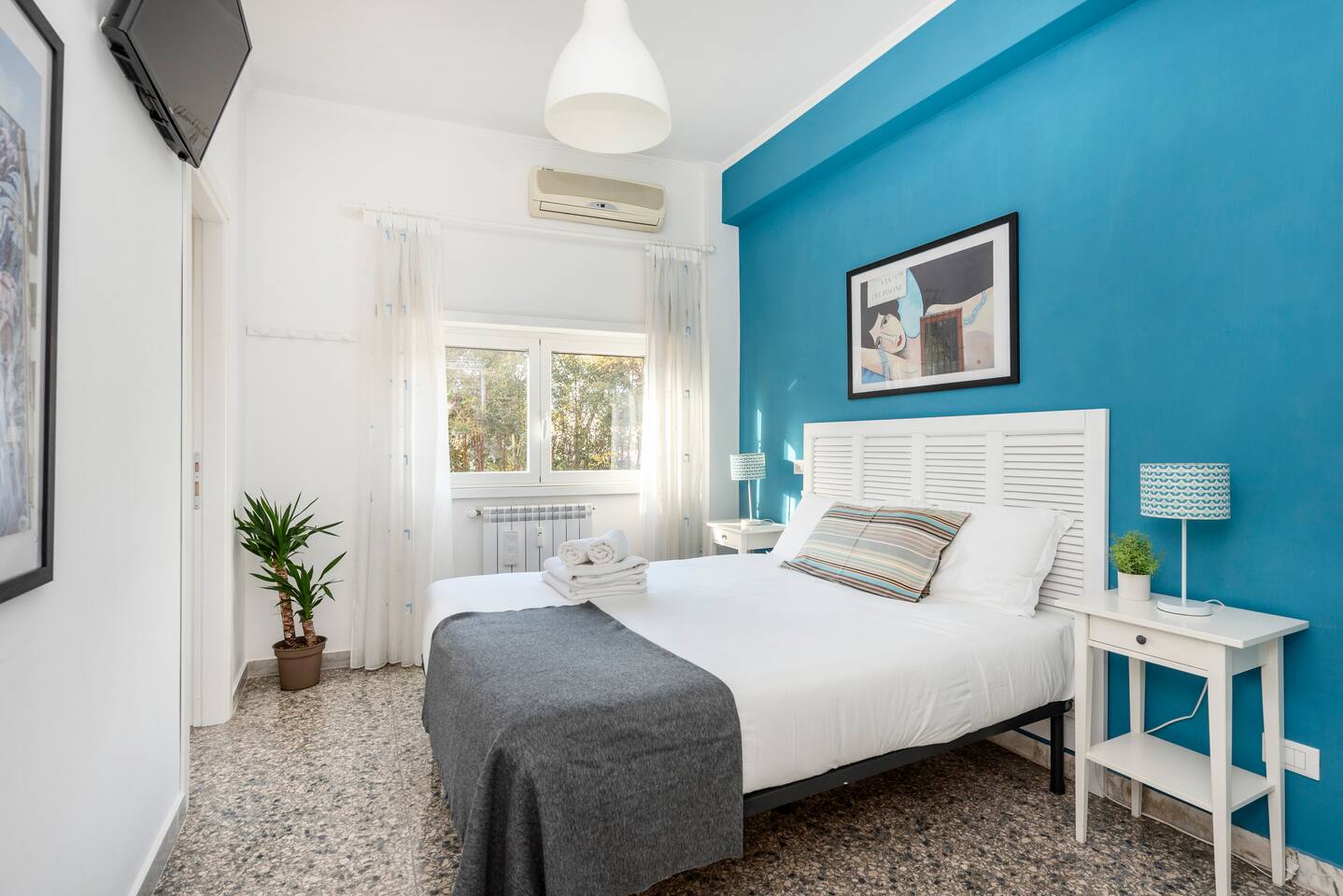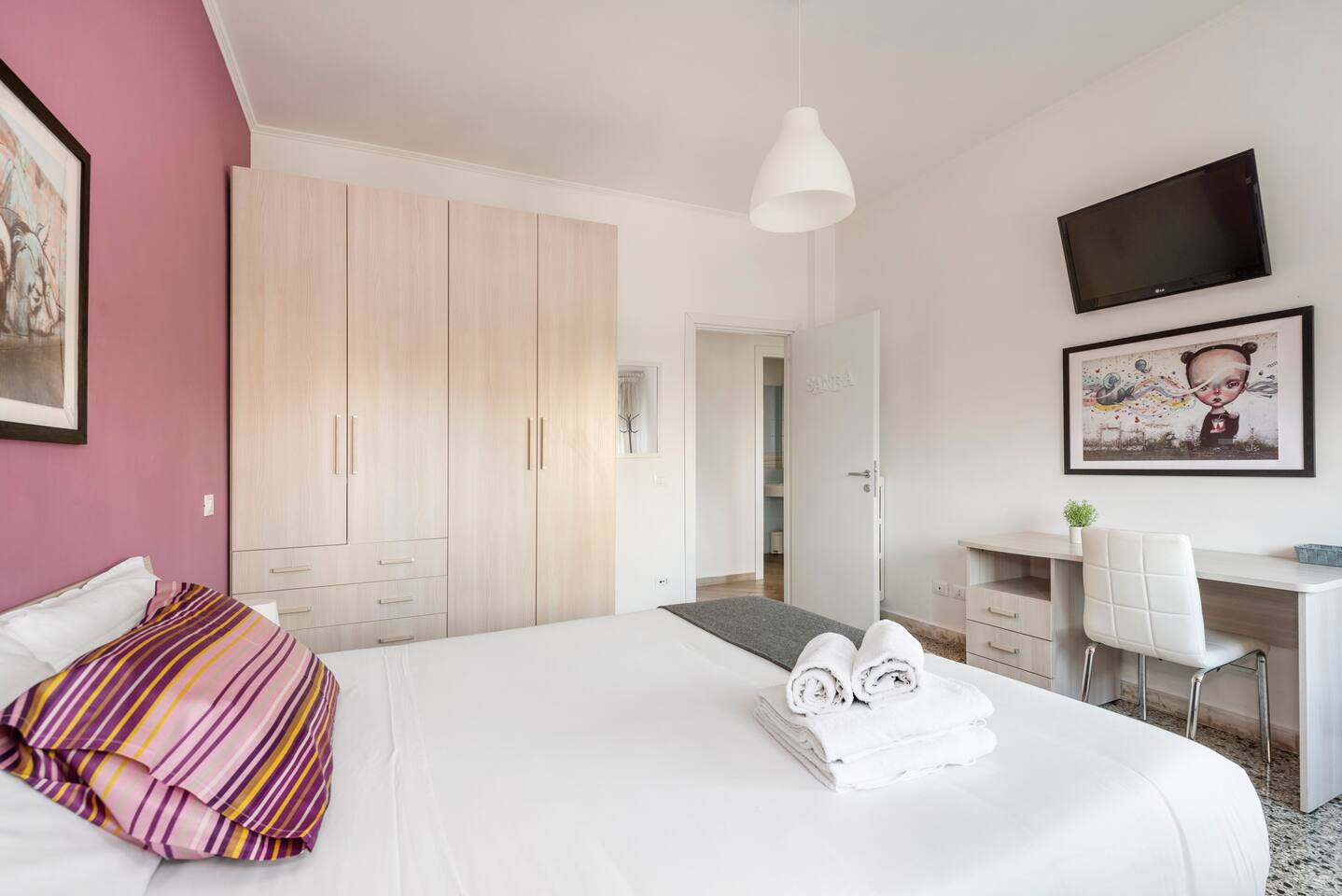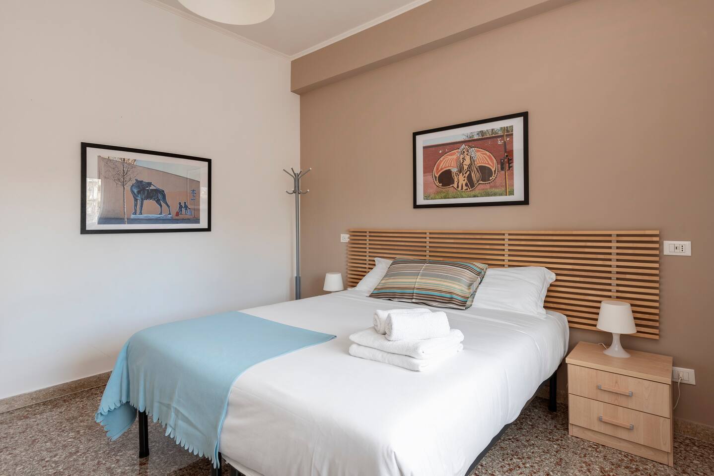Spacious and bright apartment with 3 double bedrooms, perfect for a group of 6 people. It has two bathrooms with a bidet and shower, one of them inside the room. It also has a perfectly equipped kitchen-dining room, WIFI, A/C, washer-dryer. It is decorated with photos of iconic examples of street art in Rome. It is located on the first floor with an elevator. It is very close to the Tiburtina train/metro station (line B) from where you can access the Colosseum, or the Circo Massimo.
