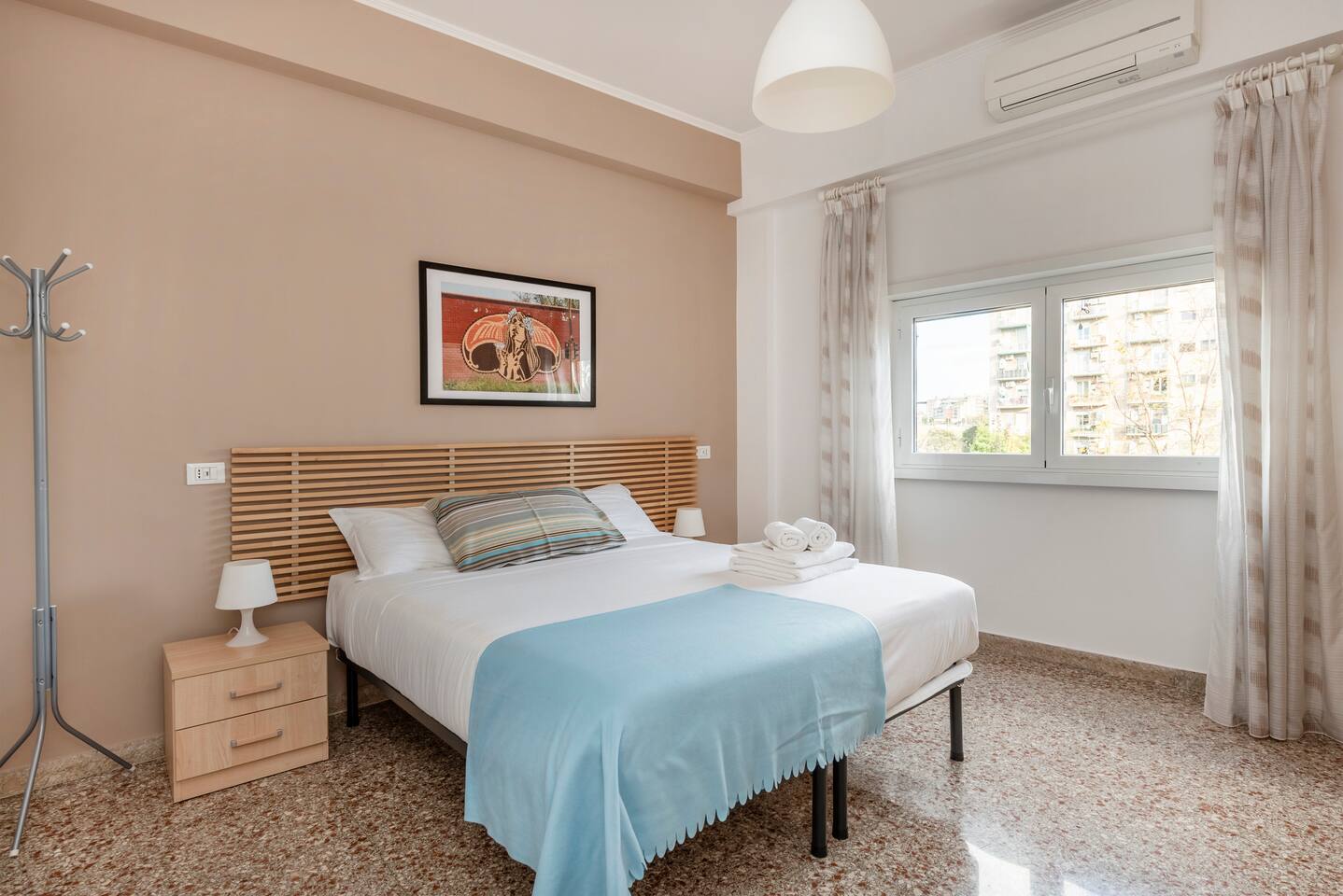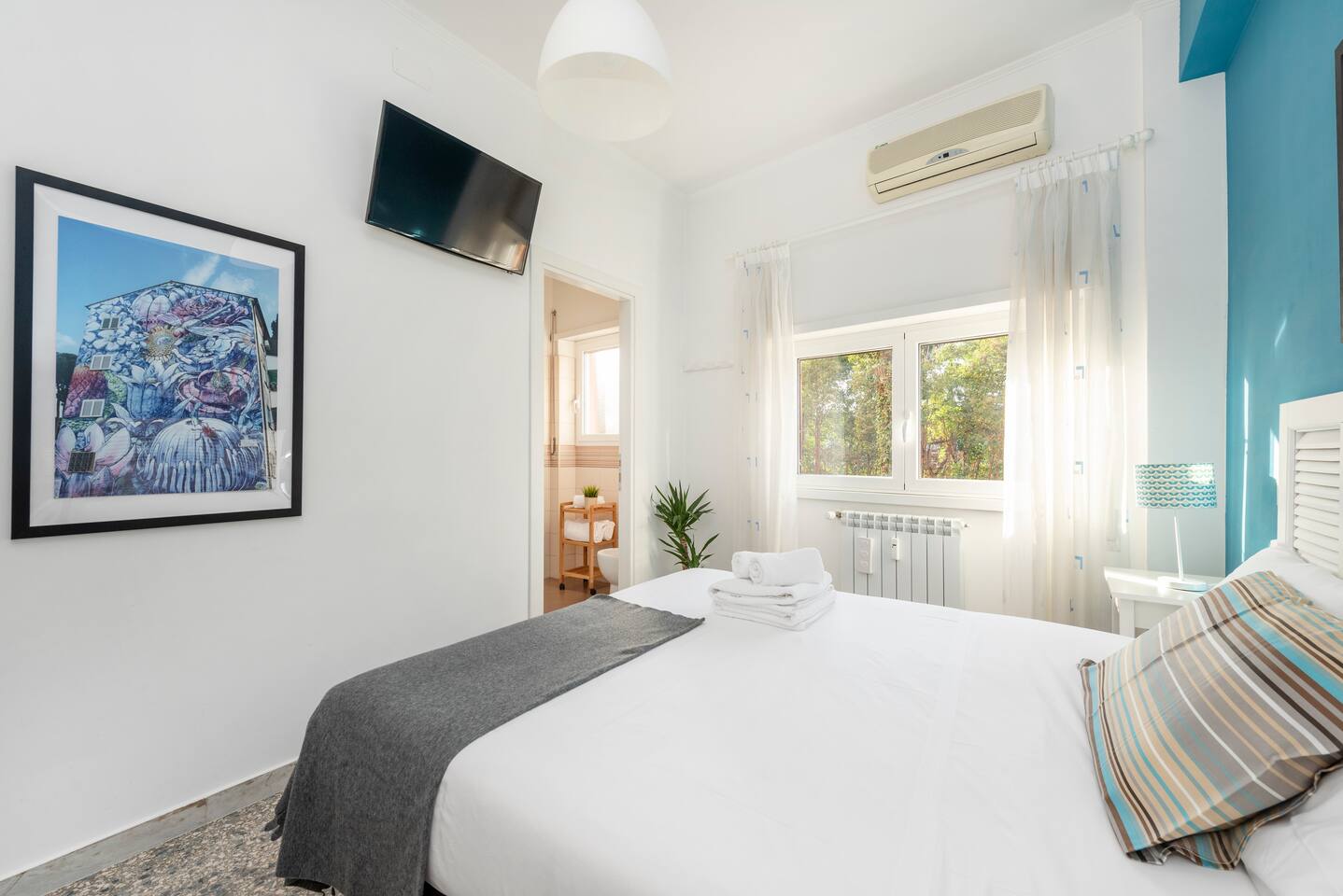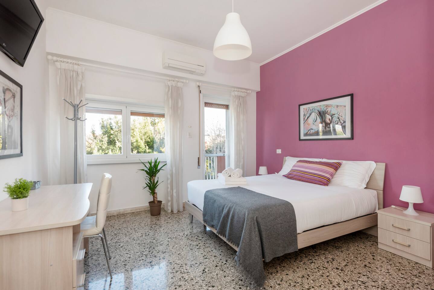 Spacious and bright apartment with 3 double bedrooms, perfect for a group of 6 people. It has two bathrooms with a bidet and shower, one of them inside the room. It also has a perfectly equipped kitchen-dining room, WIFI, A/C, washer-dryer. It is decorated with photos of iconic examples of street art in Rome. It is located on the first floor with an elevator. It is very close to the Tiburtina train/metro station (line B) from where you can access the Colosseum, or the Circo Massimo.