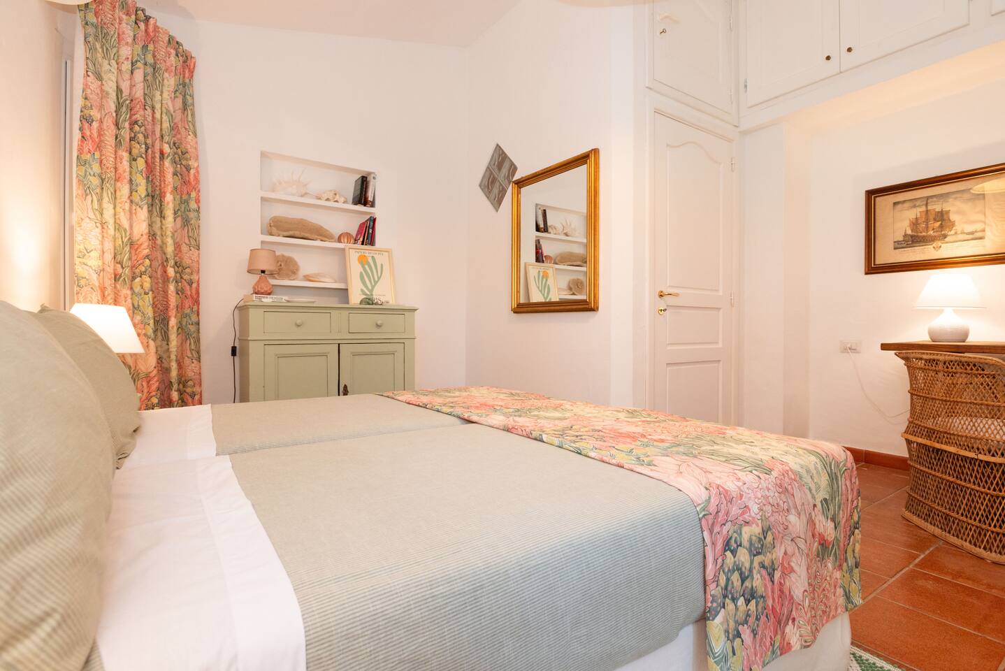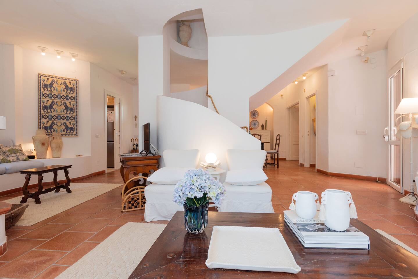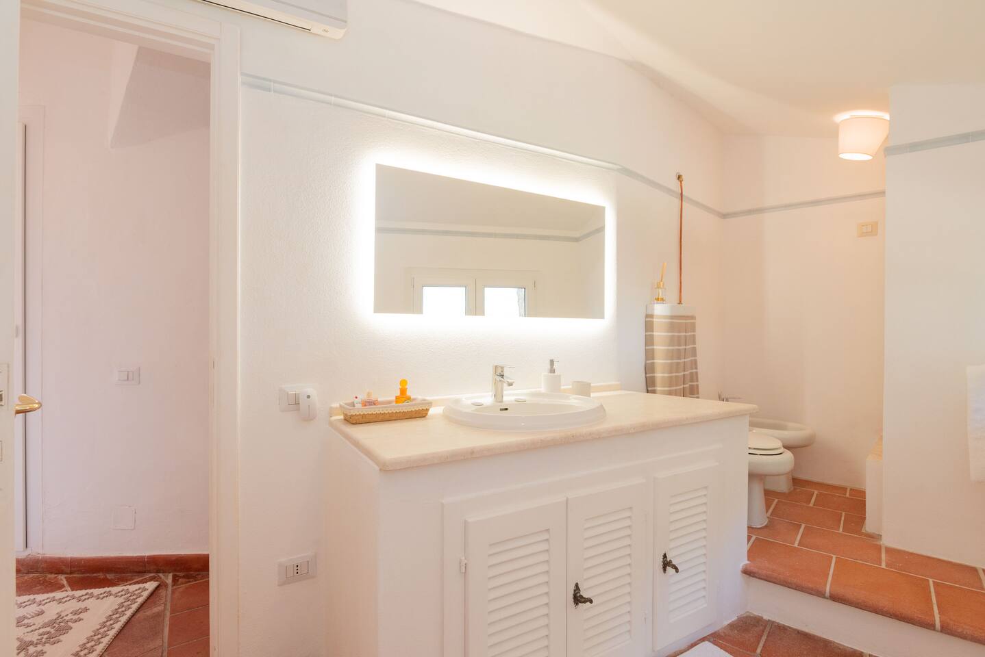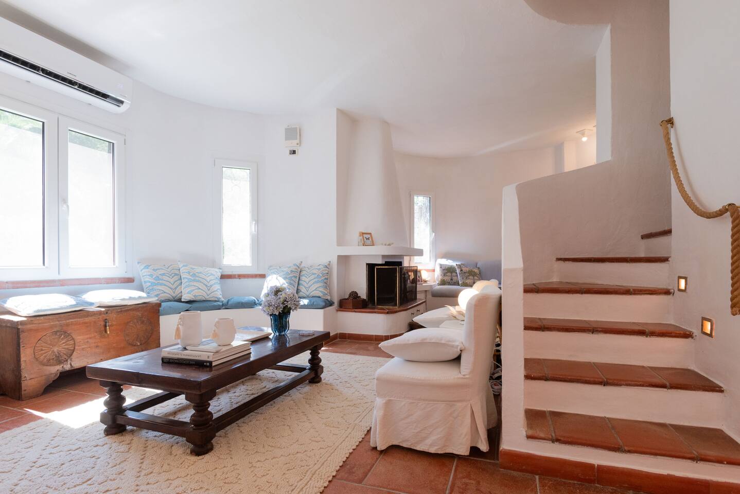 Villa Gioia is one of 20 properties arranged in a “U” facing the ocean with pine trees between us and the beach. Upstairs is not only the master bedroom and bathroom with tub and shower but a big terrace with a a lounge area and dinner table with fees of the ocean between the trees. Downstairs there is a small kitchen, living room, dinning room, and full bathroom. There is also a bedroom with its own full bathroom as well. Walk down a path thru the trees to the secret beach. If want beach service and great food there Is Molas Beach Club in the next cove North of us and just South of us near Hotel Flamingo are umbrellas and chairs to rent. Car is a must to go to the grocery store, restaurants and the famous beaches